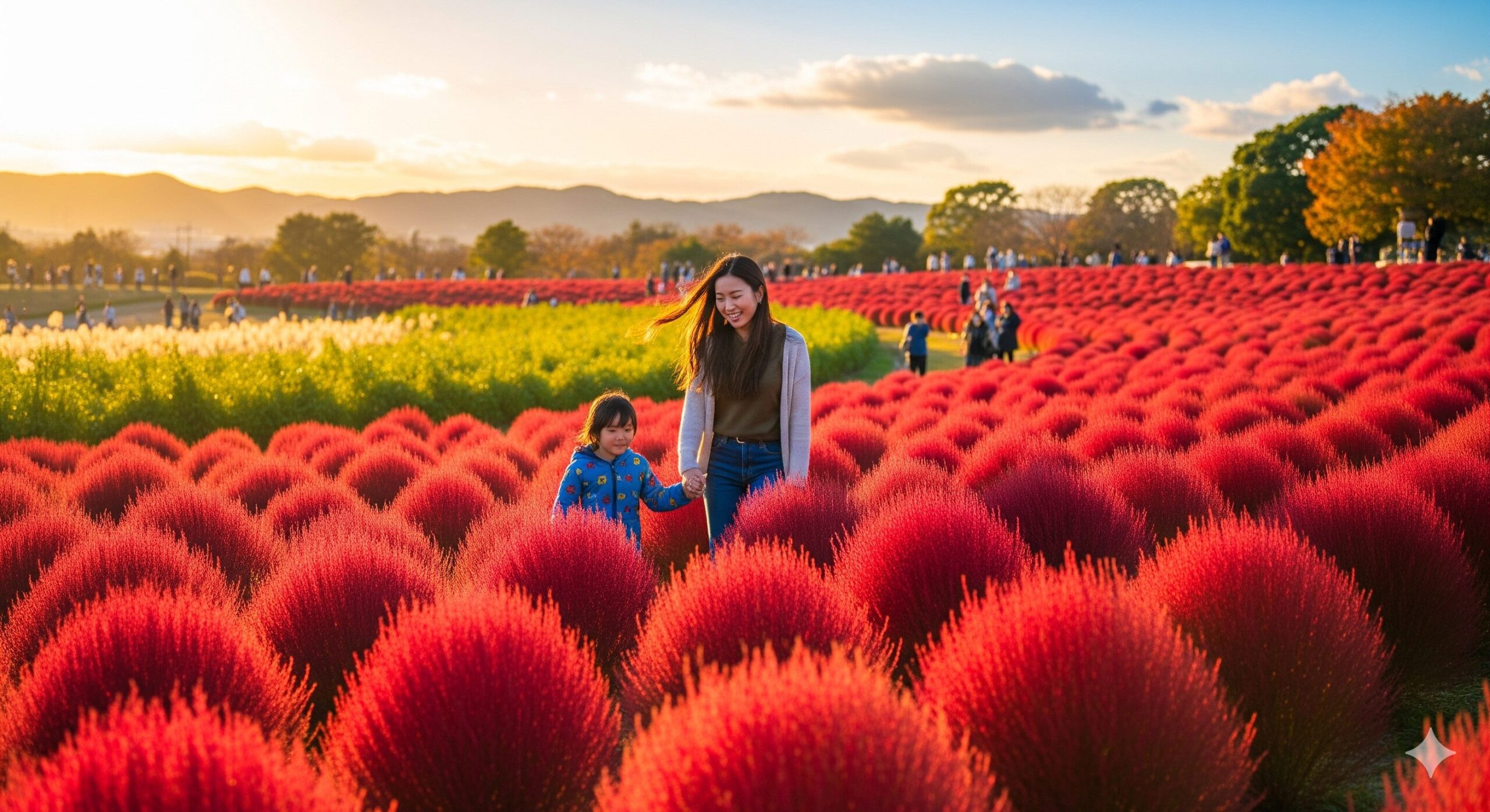 この時期の茨城県で、絶対に外せない王道スポットといえば、ひたちなか市にある「国営ひたち海浜公園」です。東京ドーム約43個分という広大な敷地を誇るこの公園は、一年を通して四季折々の花々が楽しめますが、特に10月は圧巻。みはらしの丘一面が、燃えるような真っ赤なコキアで埋め尽くされる「コキアカーニバル」が開催され、その景色はまさに絶景の一言に尽きます!